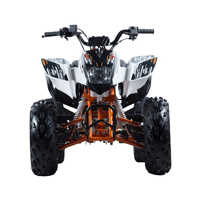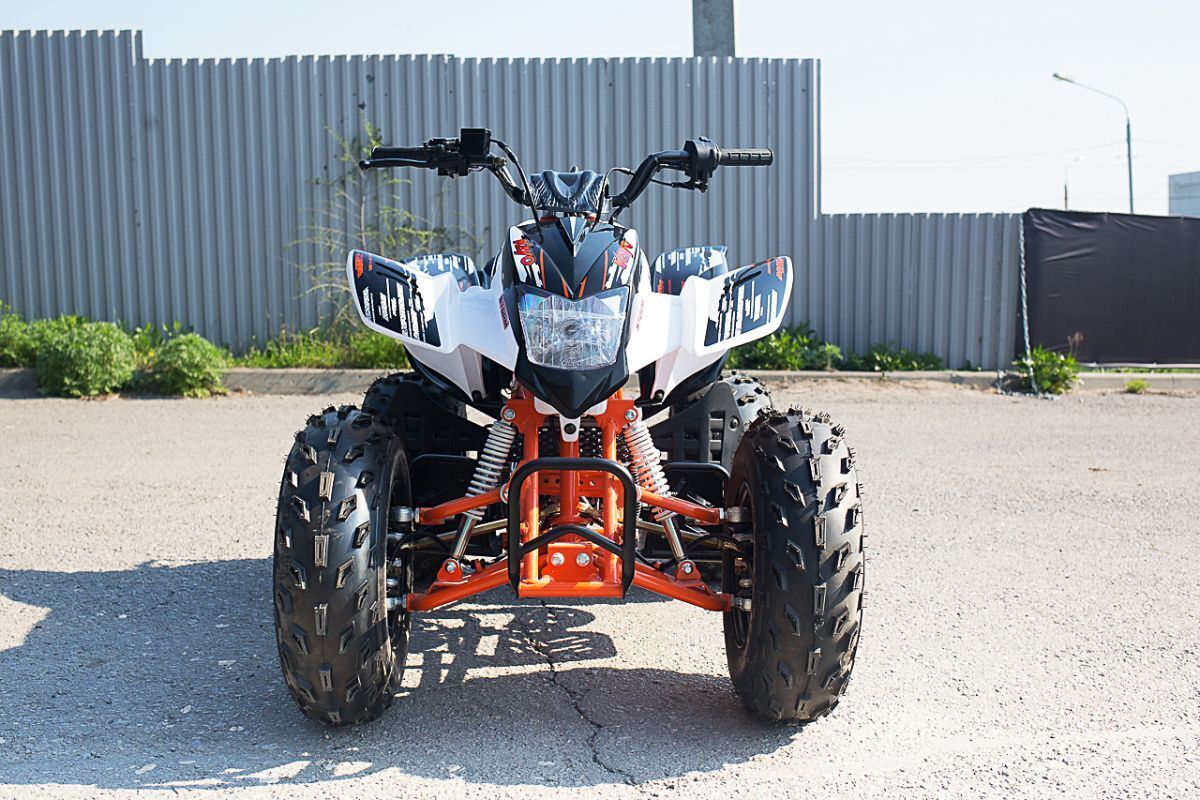 Kayo Storm – это детский спортивный квадроцикл, оснащенный 150-кубовым мотором. Учитывая мощность и габариты техники, данная модель подойдет для подростков. Станет отличным вариантом для обучения езде на мототехнике. Несомненным плюсом станет яркий спортивный дизайн, который точно не оставит вашего ребенка равнодушным. Также подойдет для взрослых, которые любят активный отдых и покатушки по бездорожью.Квадроцикл построен на стальной трубчатой раме, что позволило сделать конструкцию прочной и легкой. Спереди используется рычажная подвеска, а сзади расположился нерегулируемый амортизатор. Колеса стальные с внедорожной резиной. Такой набор гарантирует хорошую проходимость и комфорт во время внедорожных поездок.