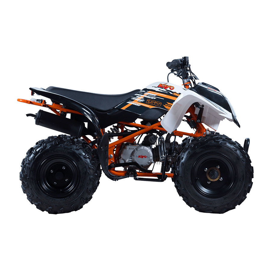 В паре со 150-кубовым мотором Kayo работает 3-ступенчатая трансмиссия с реверсом. Привод цепной на заднюю ось. Квадроцикл очень прост в управление, поэтому даже самый юный райдер без опыта вождения легко разберется с этой техникой. Также предусмотрен ограничитель скорости.