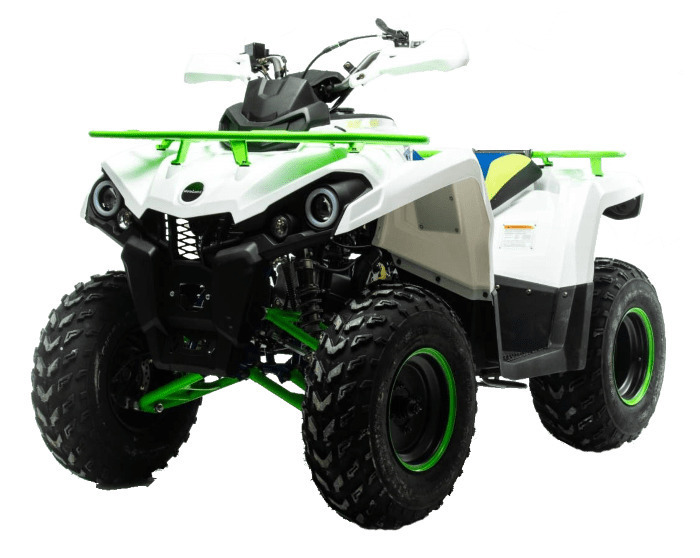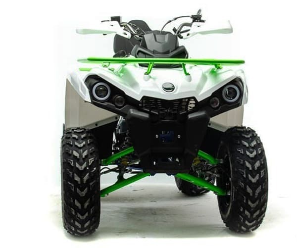 Квадроцикл доступен в белом цвете с модернизированной светодиодной оптикой, ходовыми огнями и поворотниками отлично выглядит в своем новом агрессивном стиле. Дополнительная спинка пассажира, а так же USB разъем. ATV SHARK 200 весит 160 кг, выдерживает нагрузку до 150 кг. Рама стальная, трубчатая, покрашена в цвет металлик. Прочный облицовочный пластик не ломается при сгибании, герметизированная проводка защищает от грязи. Размер задних колес — 10 дюймов (250-96), переднего — 10 дюйм (180-90), а так же усиленной задней осью. Система зажигания электронная (CDI). У квадроцикла отличный запас хода: объём топливного бака — 10 л, расход топлива — 4/5 л на 100 км. Передние светодиодные фары обновленного дизайна легко включается поворотом замка зажигания и позволяют ездить в сумерках и темноте. Данная модель оснащена 1-поршневыми тормозными суппортами, спереди и сзади. Тормозной шланг армированный. Имеется стояночный тормоз как передних так и задних колес. Есть возможность установить лебедку.