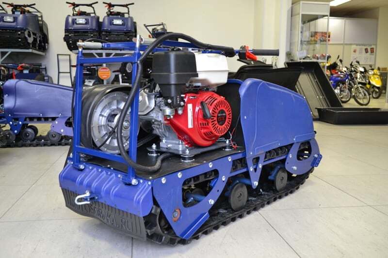 Заднее расположение двигателя позволяет легко управлять буксировщиком. Для правильной развесовки буксировщика рекомендуется загружать передний багажный отсек грузом 10-20 кг. Например канистрой с топливом. При заднем расположении двигателя, звезда ведущего вала гусеницы находится в более безопасном от ударов месте.