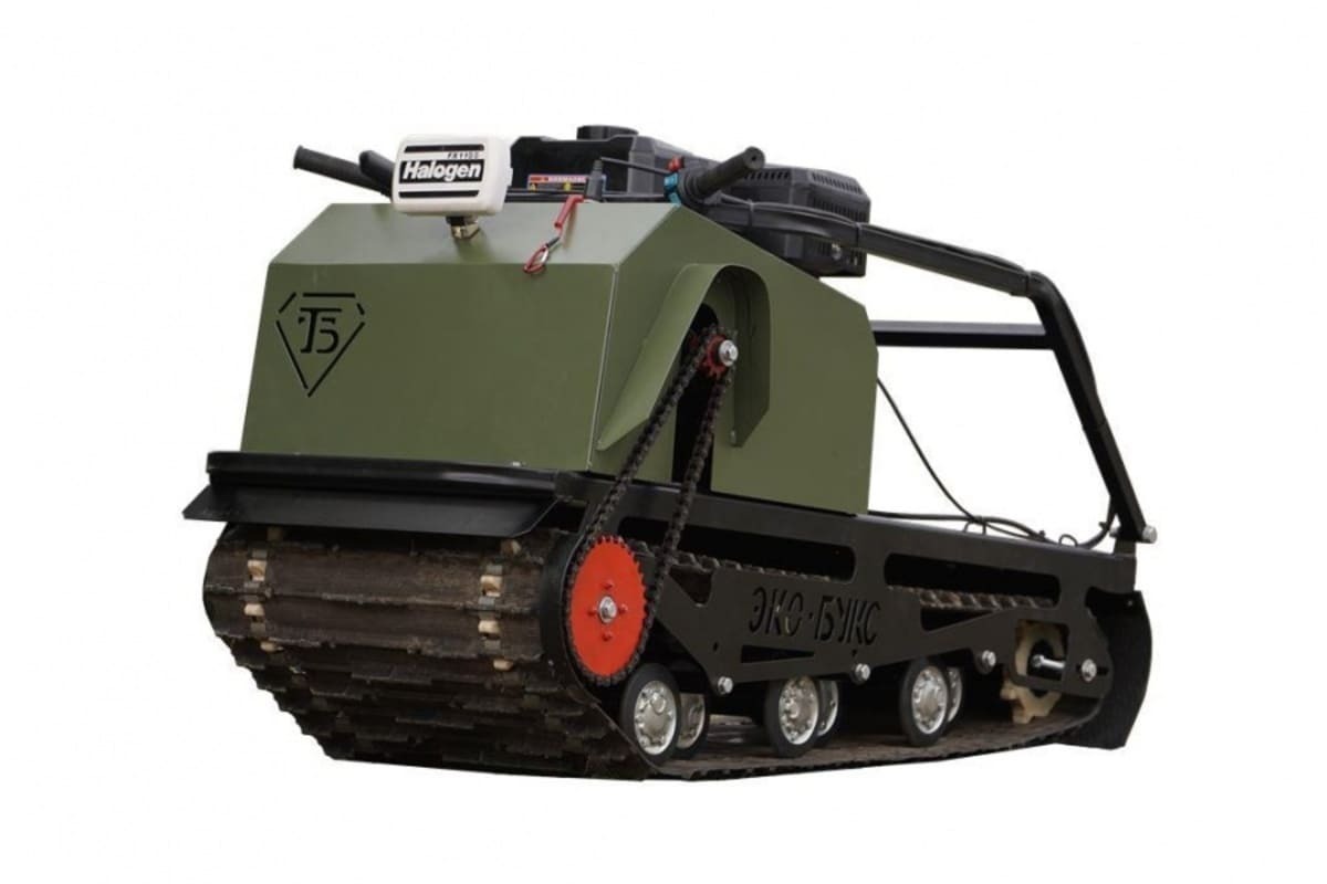 Двигатель мощностью 15 л.с. имеет переднее расположение. На ЭКО-букс установлена трансмиссия вариаторного типа. Галогеновая фара, защита цепи и брызговики включены в базовую комплектацию. Остановка мотобуксировщика ЭКО-букс осуществляется при помощи чеки безопасности. По желанию покупателя может быть установлен переключатель рулевого управления.