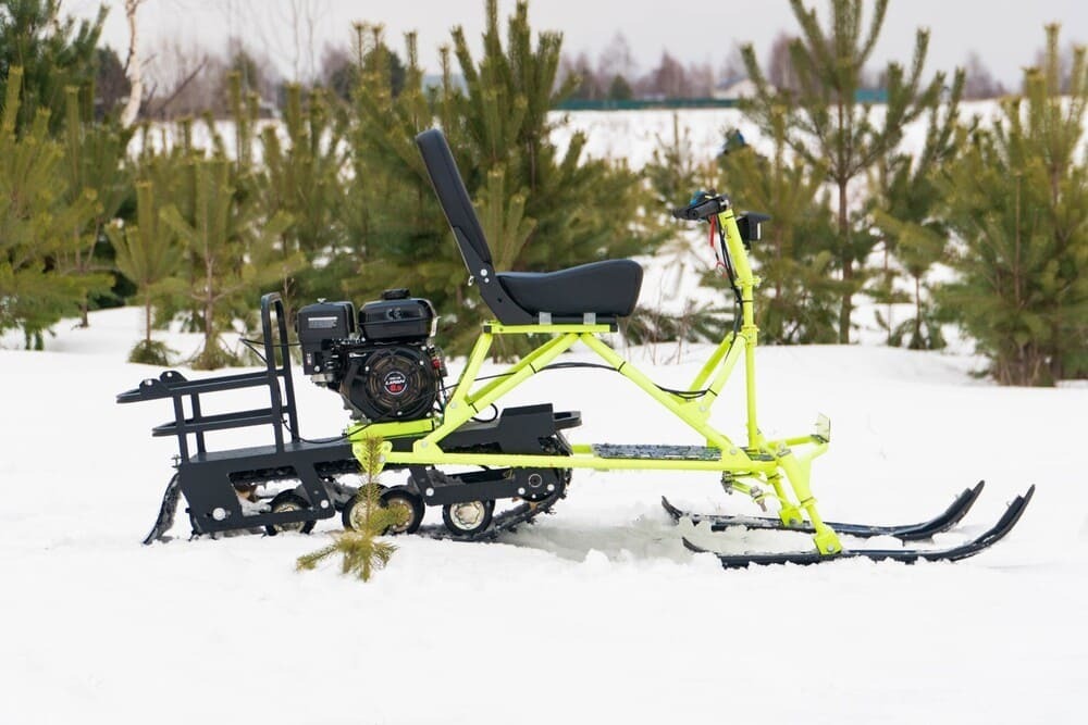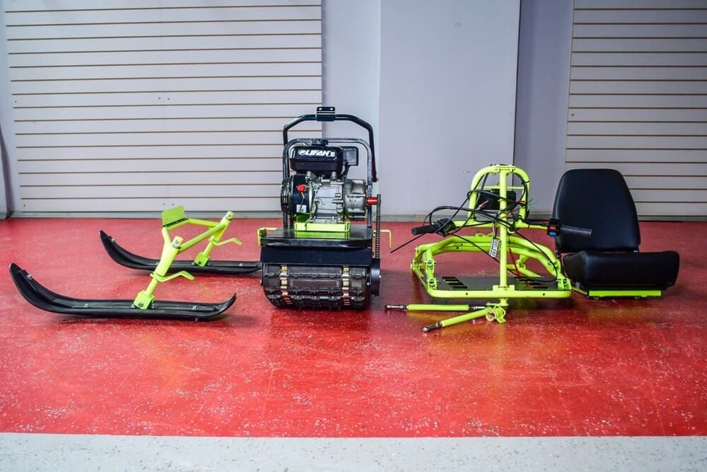 Мощный бензиновый двигатель Автоматическая трансмиссия Катковая подвеска Гусеница шириной 380 мм Разборная конструкция Лыжный модуль в комплекте Поставляется без АКБ