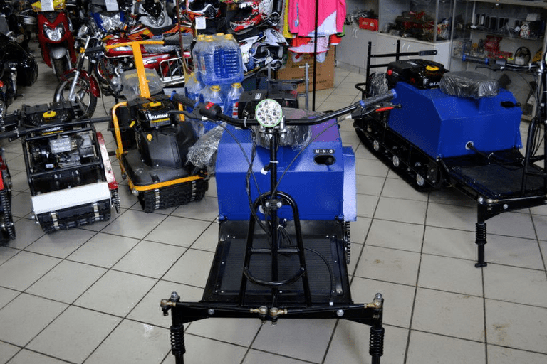 Мотособака весит 130 кг, а размеры ее составляют 230 см в длину, 50 см в ширину и 90 см в высоту. Модель оснащена гусеницей шириной 500 мм. Гусеница в сочетании с катковой подвеской способна проходить спокойно по льду и даже по территории без снега.