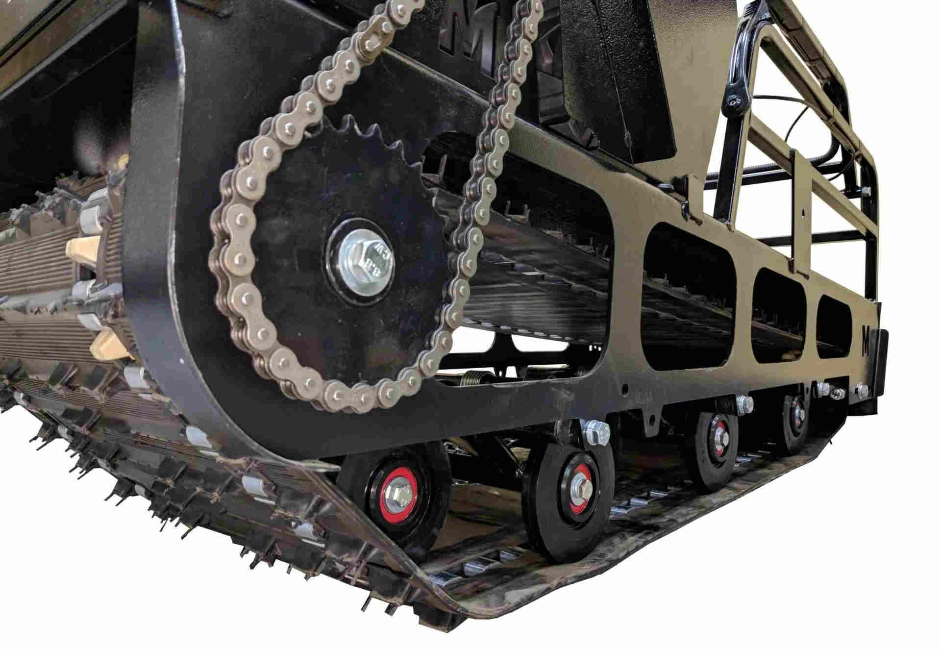 Преимущество этой модели — использование лазерной резки при изготовлении рамы и опорной плиты мотобуксировщика. Лазерная резка обеспечивает надлежащую точность заготовок. Нужная форма заготовкам придается гибочным станком. Толщина металла 4 миллиметров обеспечивает прочность конструкции при эксплуатации и гарантирует надежную эксплуатацию в течении долгих лет. Подшипники в этой модели мотособаки использованы самоцентрирующиеся в чугунном корпусе. Способ крепления подшипников снаружи.