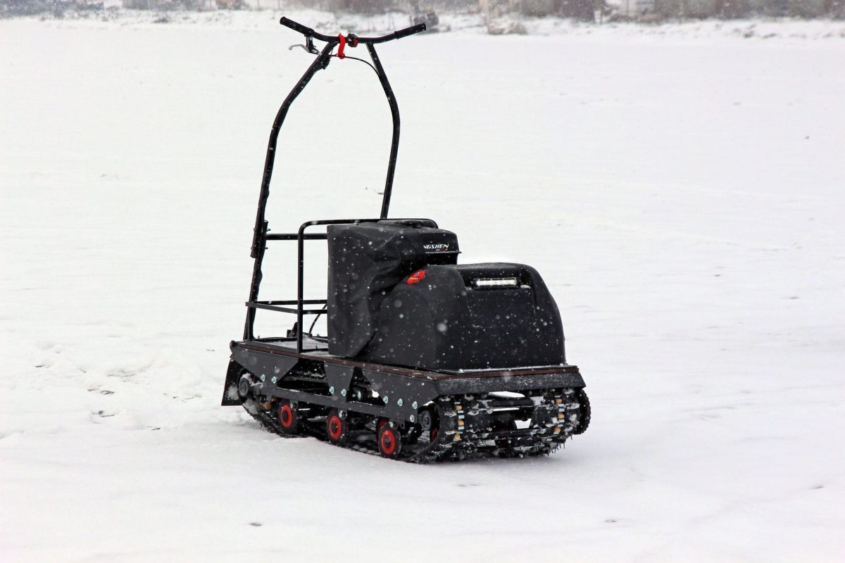 Мотособака весит 95 кг, а размер ее составляет 141 см в длину, 60 см в ширину и 70 см в высоту. Благодаря своей легкости и компактности, мотобуксировщик может маневрировать и проходить по рыхлой и мягкой почве. Кроме того, у мотобукса есть катковая подвеска, которая улучшает ход, обеспечивает устойчивость на неровной поверхности, а также смягчает удары и вибрации от дороги.