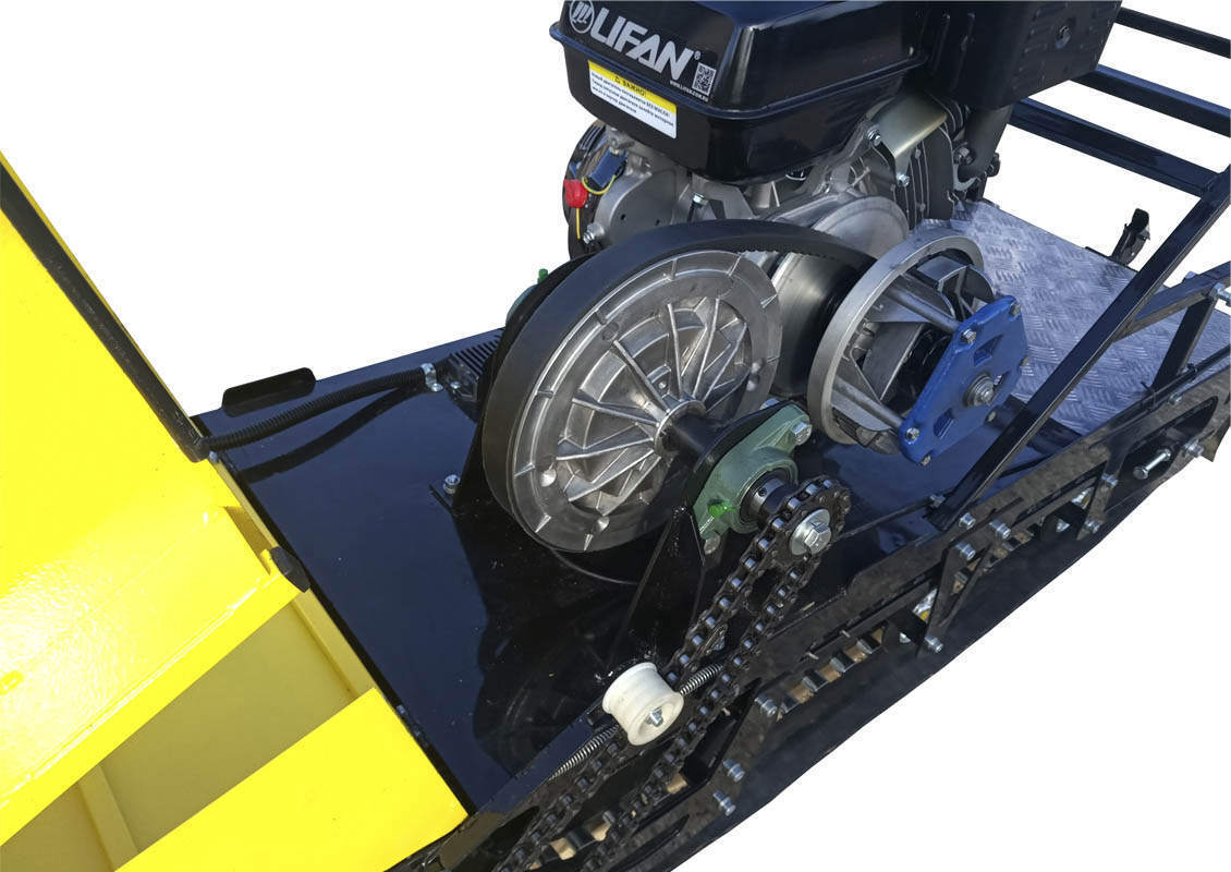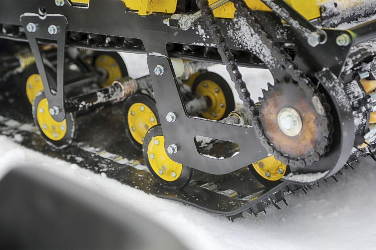 В конструкции мотовездехода используется цельная резиновая гусеница Composit шириной 500 мм. Гусеница в сочетании с катковой подвеской способна проходить спокойно по льду и даже по территории без снега.