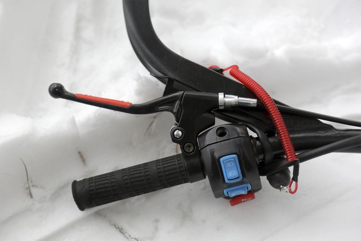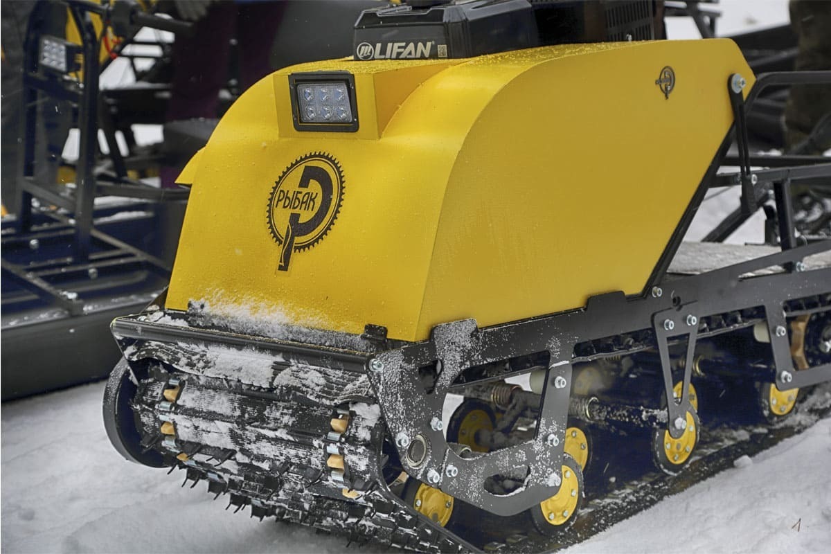 В конструкции мотовездехода используется цельная резиновая гусеница шириной 500 мм. Гусеница в сочетании с катковой подвеской способна проходить спокойно по льду и даже по территории без снега.