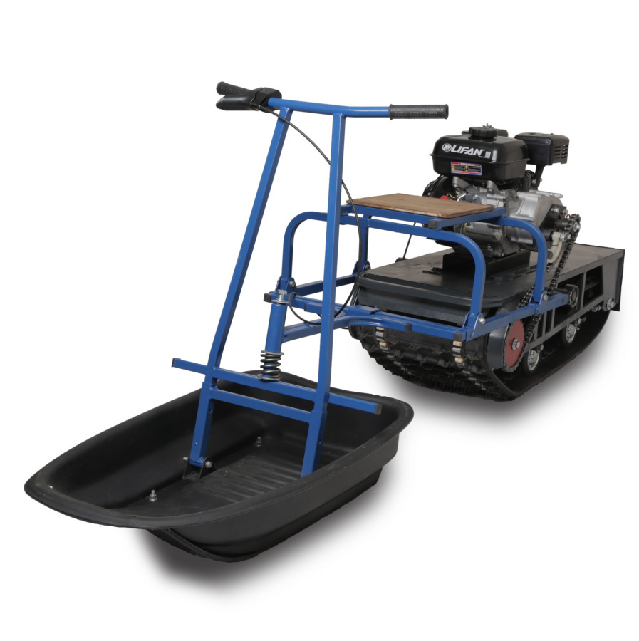 На мотобуксе установлена катковая подвеска. Катки устанавливаются на оси и предназначены для смягчения ударов и вибраций, возникающих при движении по неровной местности. Подвеска также способствует лучшей проходимости и устойчивости мотобуксировщика, обеспечивая более комфортное и безопасное передвижение как в сельской местности, так и на дорогах.