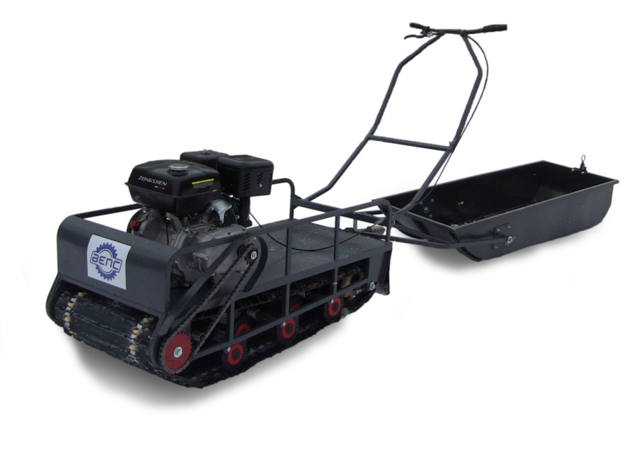 На мотобуксе установлена катковая подвеска. Катки устанавливаются на оси и предназначены для смягчения ударов и вибраций, возникающих при движении по неровной местности. Подвеска также способствует лучшей проходимости и устойчивости мотобуксировщика, обеспечивая более комфортное и безопасное передвижение как в сельской местности, так и на дорогах.