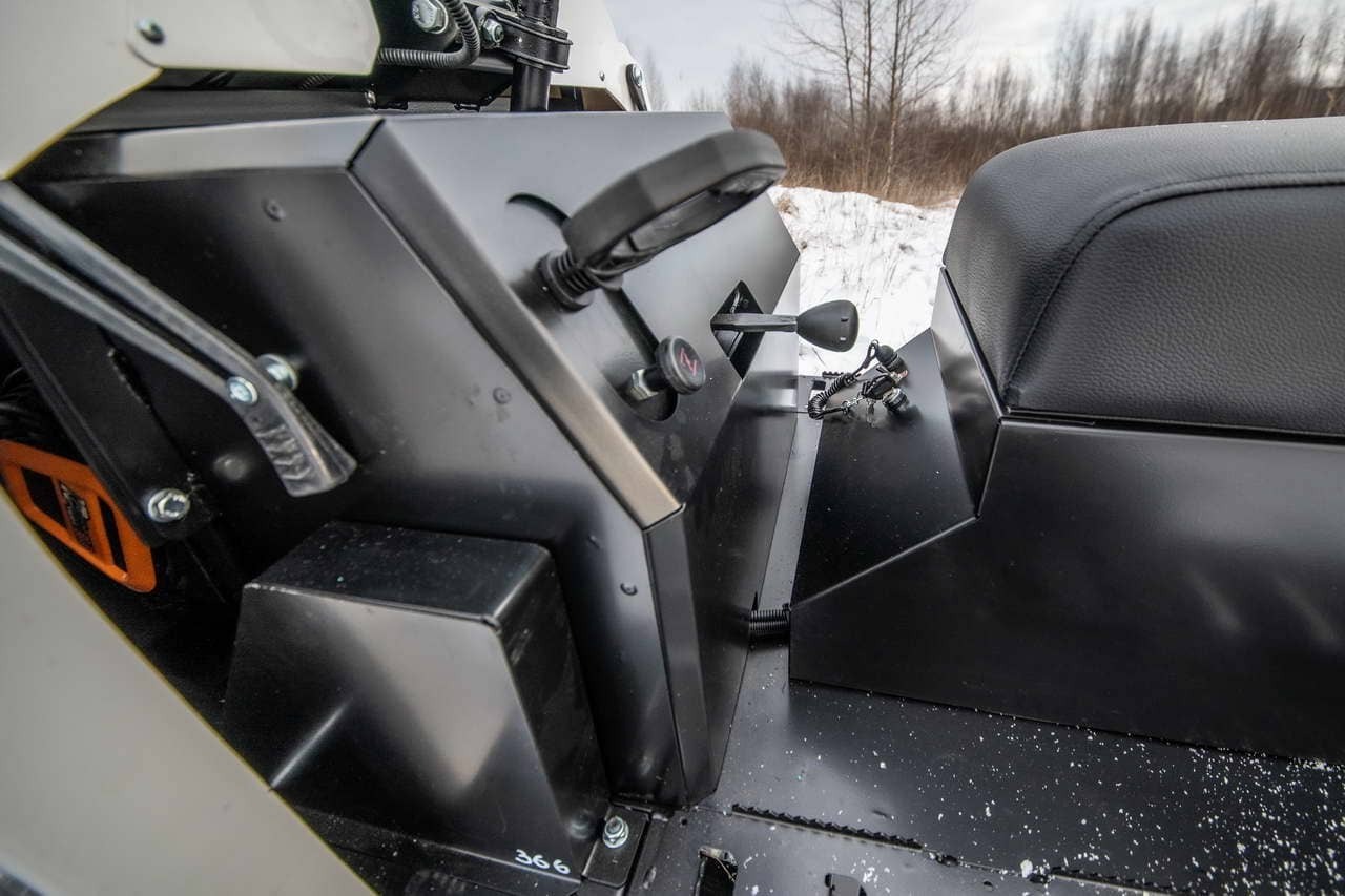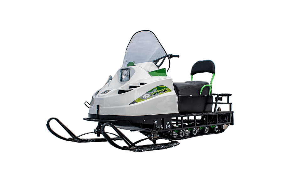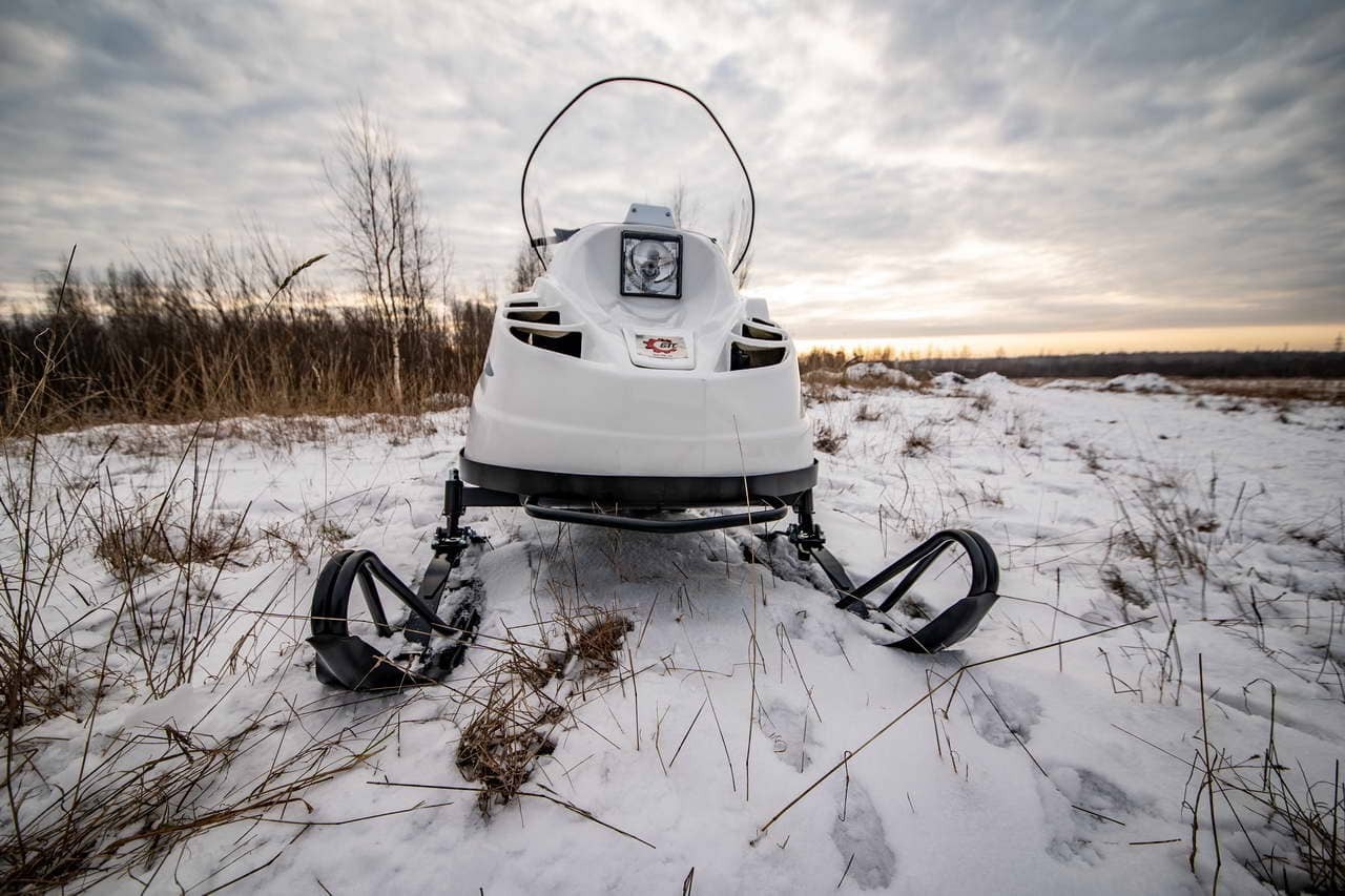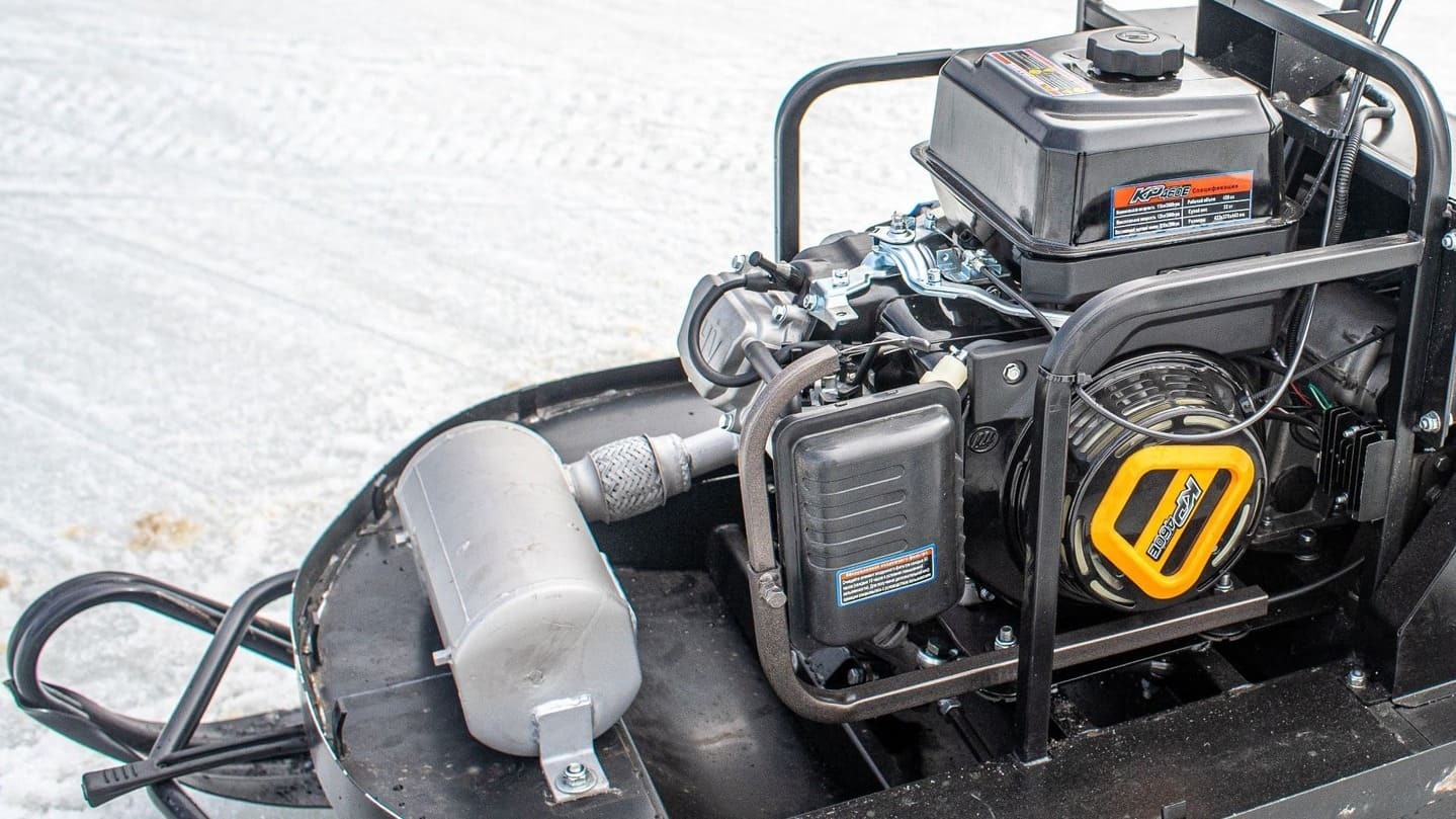 Снегокат оснащен защитой двигателя, улучшенной задней подвеской с амортизатором. Гусеница имеет длину 2828 мм и ширину 500 мм. Снегоход также имеет простую и надежную переднюю 2-х лыжную рессорную подвеску и стальные лыжи, что обеспечивает отличную управляемость и маневренность.