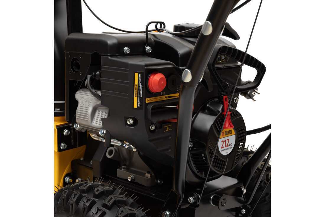 - Металлический желоб для выброса снега. Находится в удобном месте, позволяет перенаправлять выброс снега с помощью рычага.
