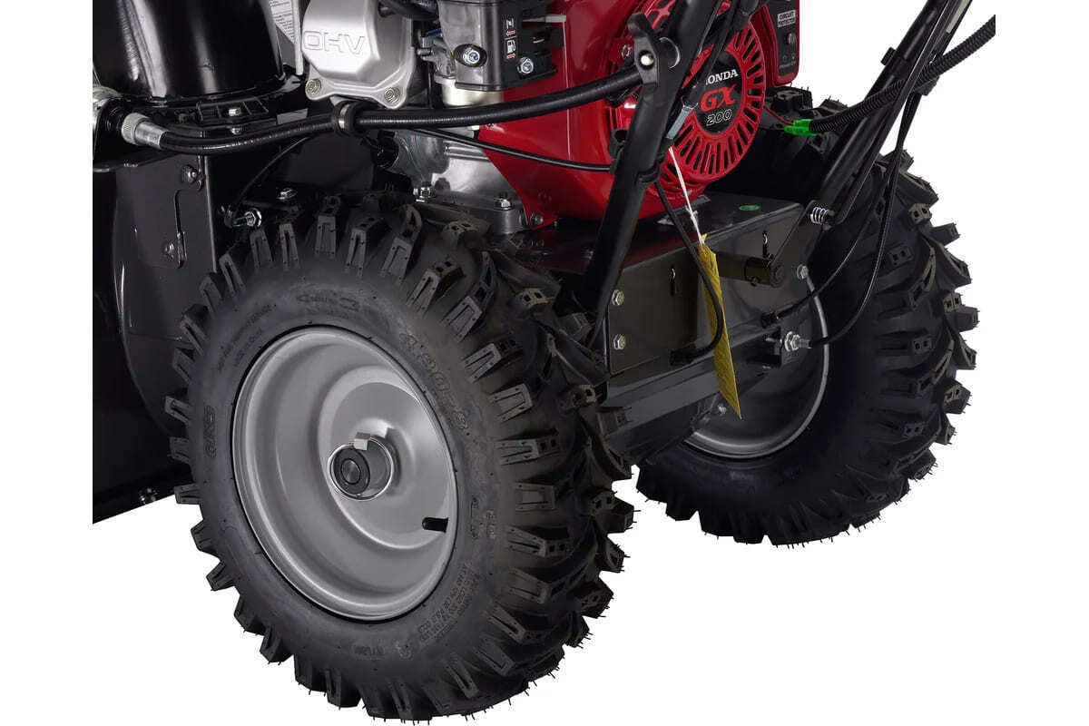 Высокая производительность обеспечивается эффективной конструкцией снегоуборщика и 4-х тактным бензиновым двигателем Honda GX 200 (196 см3, 4 кВт / 5,5 л.с.). 6 передних и 2 задние скорости, а также запатентованная система отключения блокировки дифференциала с помощью курков (Dual-Trigger Steering), обеспечивают максимальную маневренность. Ширина ковша отлично подойдёт чтобы расчистить большие площадки, дорожки и парковочные места. Чтобы шнеки не задевали неровности, а также не повредили покрытие, ковш регулируется по высоте.